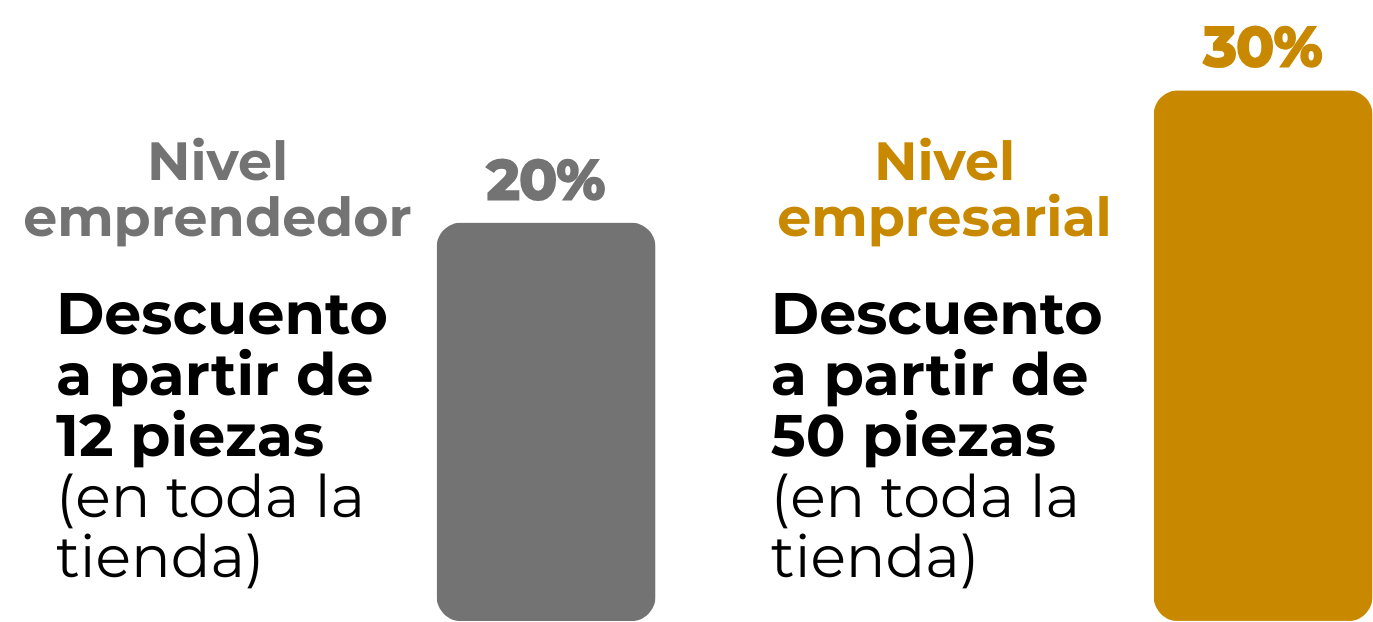*Escala de mayoreo en toda la tienda con descuentos del 20% a partir de 12 piezas y 30% a partir de 50 piezas.